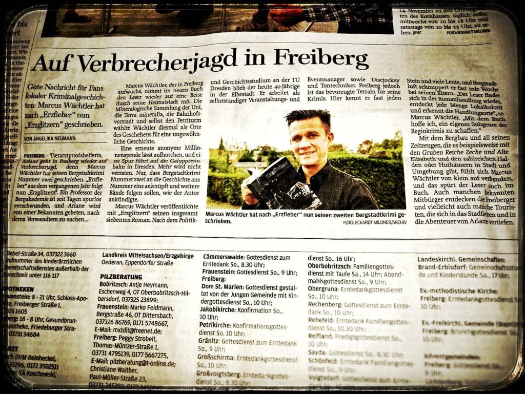 Mit ein wenig delay haben wir es mal wieder in die Freie Presse geschafft. Vielen Dank an die Journalisten in Freiberg. In #Erzglitzern folgen wir der jungen Praxishilfe Ariane bei ihrem unfreiwilligen Zusammentreffen mit finsteren Verbrechern. Ariane versucht, das Verschwinden eines Mineraliensammerlers im wunscherschönen Erzgebirge aufzuklären.
